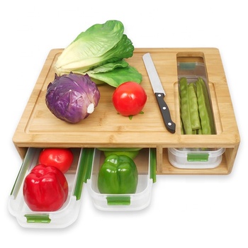 Multifunções Personalizado Grande Fantasia Cozinha Bambu Placa De Corte com 4 Recipientes e Faca Set